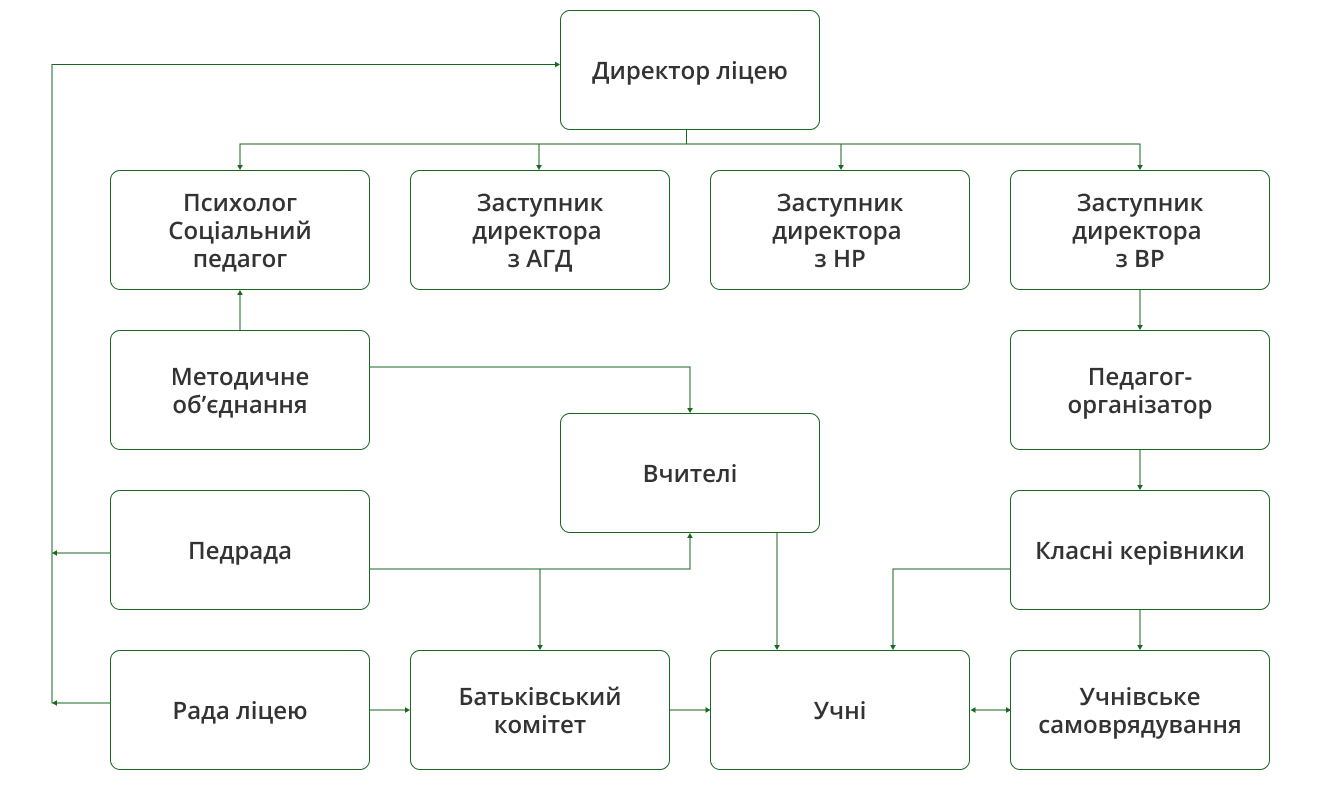 Управління ліцеєм здійснюється на принципах прозорості та колегіальності. Ми забезпечуємо ефективну взаємодію між адміністрацією, педагогічною радою, батьківським комітетом та учнівським самоврядуванням.